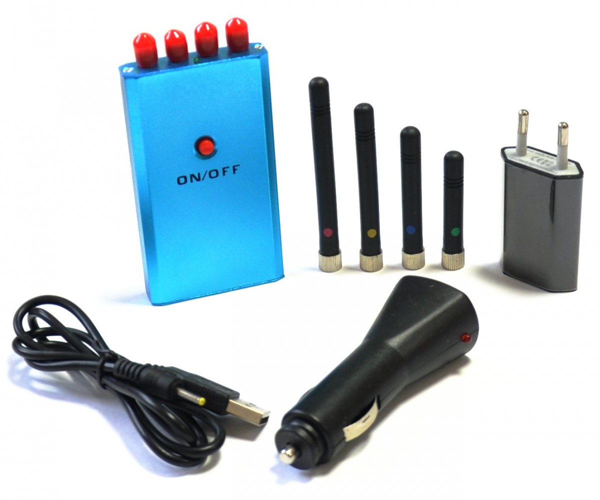 Преимущества: - Блокировка сигналов вызова мобильных телефонов. Прибор блокирует стандарт связи GSM 900МГц, GSM1800, 3G - Блокировка спутниковой GPS навигации. В заданном радиусе блокирует работу трекеров слежения и навигаторы. - Автономное питание. Встроенный аккумулятор позволяет подавителю работать до одного часа