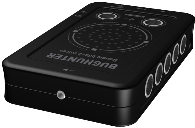 Подавитель микрофонов, подслушивающих устройств и диктофонов "BugHunter DAudio bda-3 Voices" с 7 УЗ-излучателями (5 на боковой и 2 на верхней панели) и акустическим глушителем отличается улучшенной системой подавления (изменен ультразвуковой рисунок) и наличием выхода для подключения внешней УЗ-колонки. Два дополнительных УЗ-излучателя, направленных вертикально вверх, создают "виртуальную стену", обеспечивающую 100-процентную защиту пользователя от шпионажа. Прибор глушит любые известные микрофоны (в том числе радио, проводные и профессиональные с возможностью считывания вибраций с окон), диктофоны на расстоянии до 7 метров или увеличивая площадь воздействия за счет использования УЗ колонок. Имеет "ТУРБО режим" обеспечивающий максимальную эффективность УЗ-помехи при работе на номинальной мощности, поддерживает регулировку громкости акустической помехи (в том числе бесшумную работу), может питаться от аккумулятора/сети 220 В.