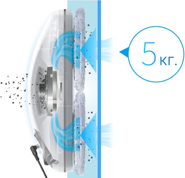 Высокая сила притяжения робота к поверхности (до 5кг) способна удержать в пять раз больший чем вес робота (1 кг). Благодаря этому Hobot-R3 надёжно удерживается на вертикальных поверхностях и эффективно удаляет пыль и грязь
